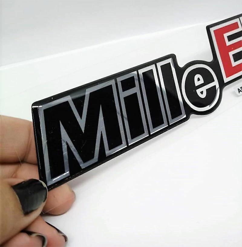 1 Adesivo Resinado Mille EP / Fabricado em Poliéster Cromado / Dimensões: 16,9 x 4,5 cm