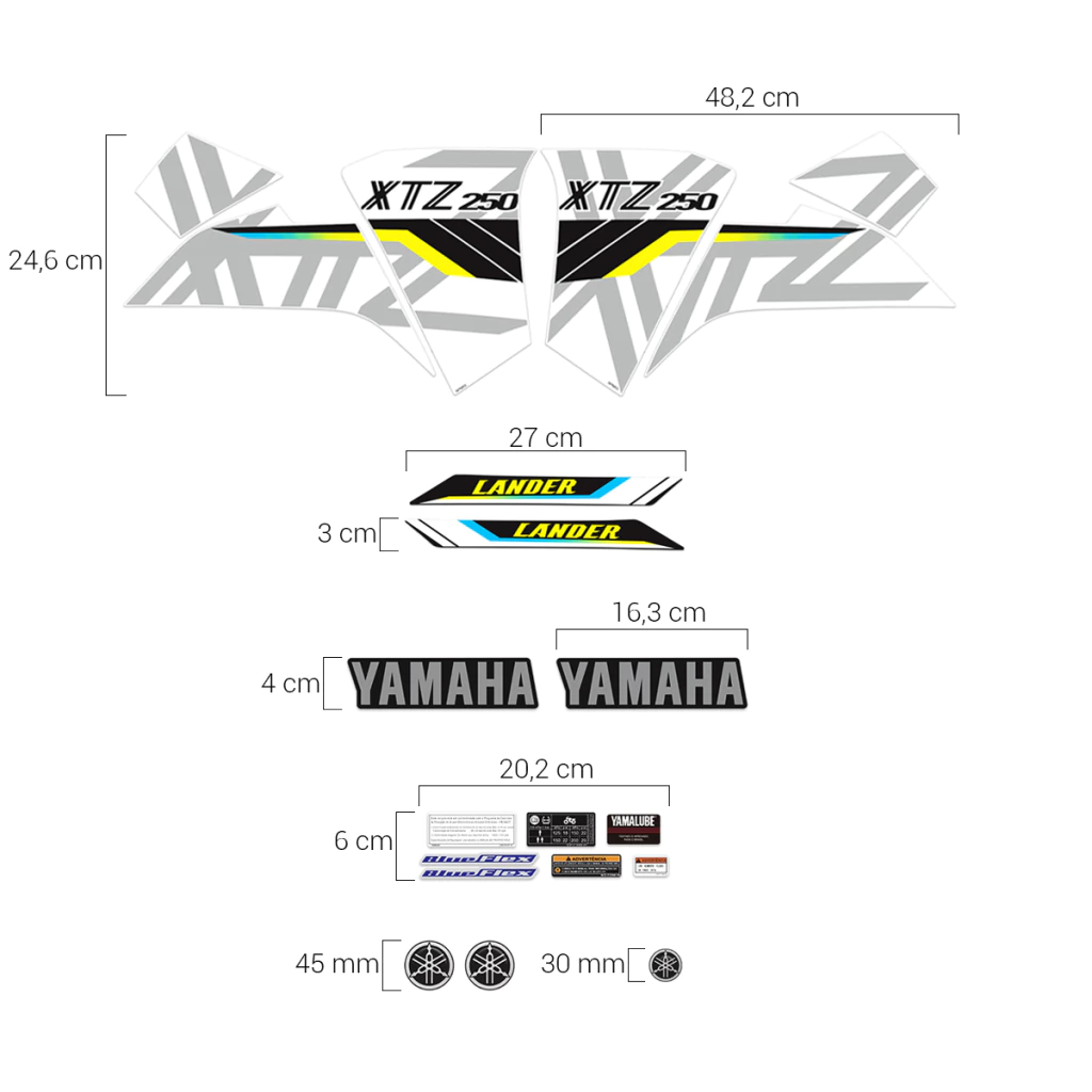Kit Adesivos Yahama Lander Xtz 250 2020 Faixa do Tanque + Emblemas Logos Resinados + Etiquetas de Advertência