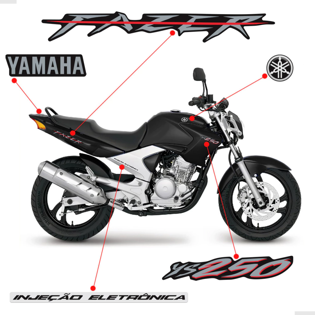 Kit Adesivos Para Yamaha Fazer 250 YS 2008 Moto Preta + Emblemas Resinados - Genérico