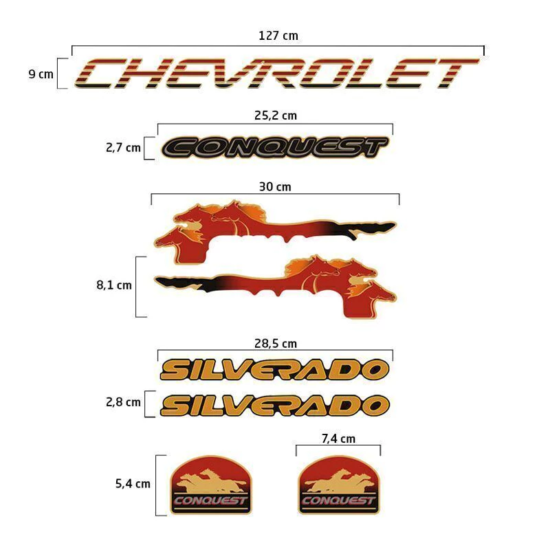 Kit Adesivos Silverado Conquest 1999/2000 Emblemas Resinados + Faixa Traseira Chevrolet + Faixa Lateral Dourada