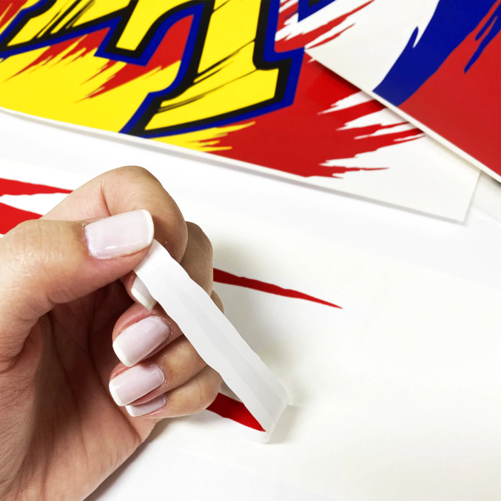 Os adesivos são produzidos em vinil automotivo autocolante importado, dispensando a utilização de produtos para a fixação. Sua impressão é feita em maquina UV, com essa tecnologia as faixas estão protegidas por mais tempo da ação do tempo (Exposição ao sol e a chuva), dando mais durabilidade e dispensando a necessidade de verniz no final da aplicação.