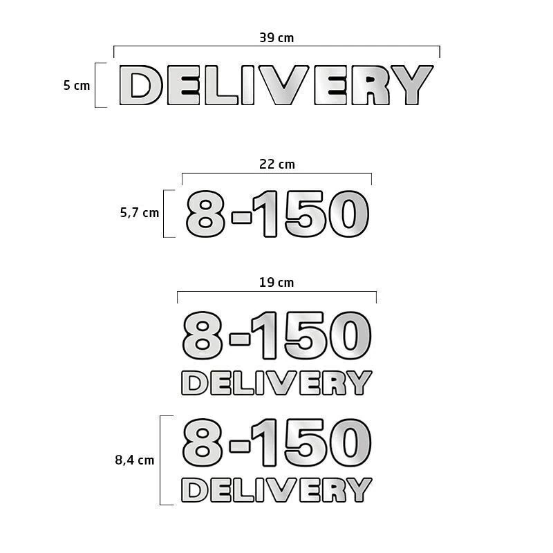 2 Emblemas 8-150 Delivery Resinado (lateral) / Fabricado em Poliéster Cromado / Dimensões: 19 x 8,4 cm