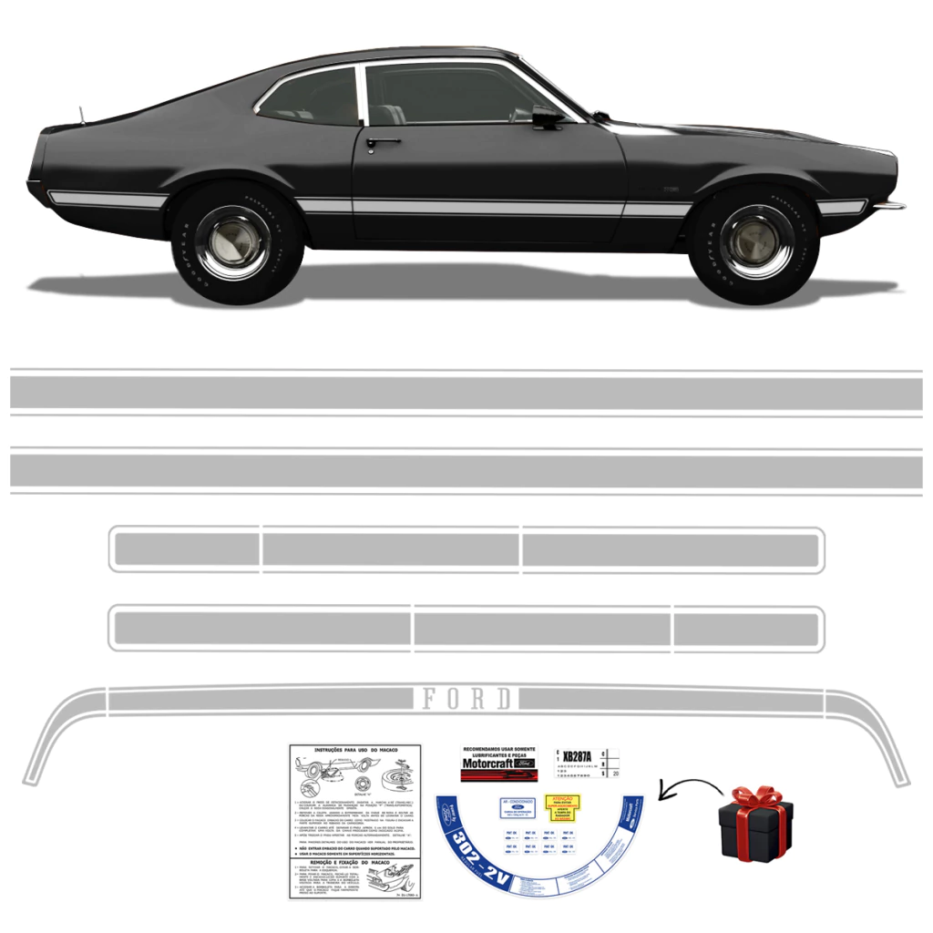 Kit Faixa Ford Maverick Fase 1 - 1973 1974 1975 1976 Adesivo Cinza Lateral e Traseira + Etiquetas de Advertência Motor Completo **BRINDE**