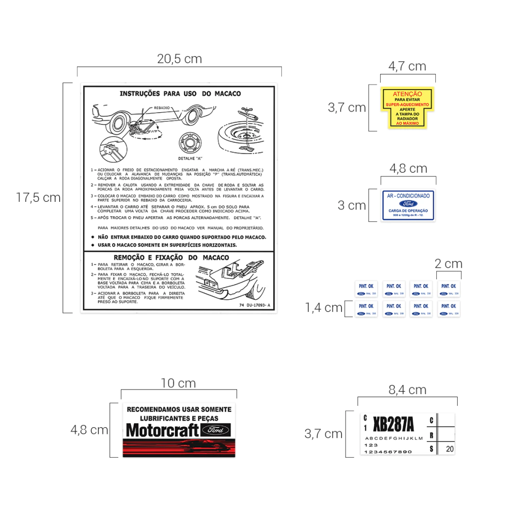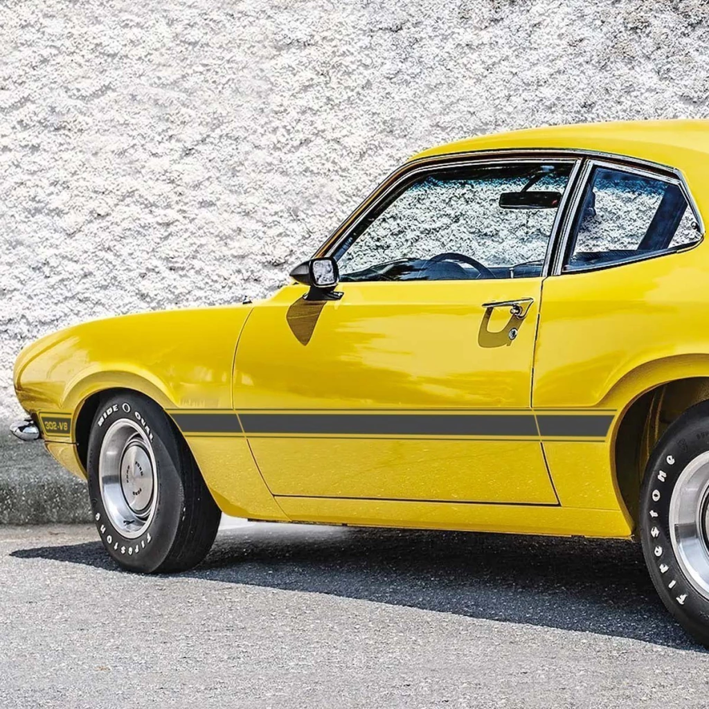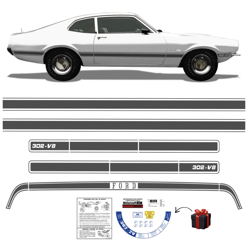 Kit Faixa Ford Maverick 308-V8 Fase 1 - 1973 1974 1975 1976 Adesivo Grafite Lateral e Traseira + Etiquetas de Advertência Motor Completo **BRINDE**