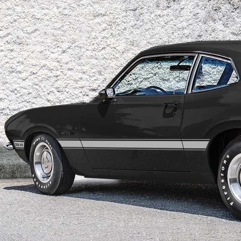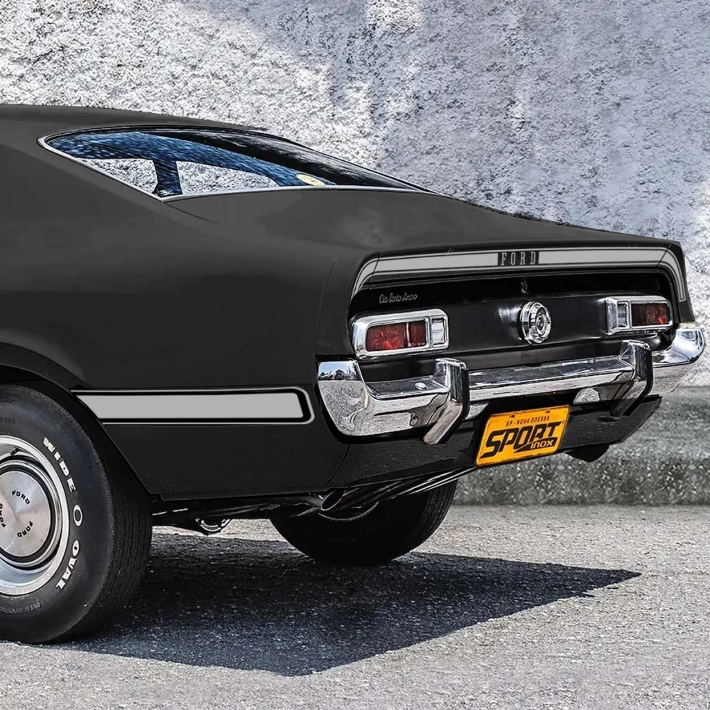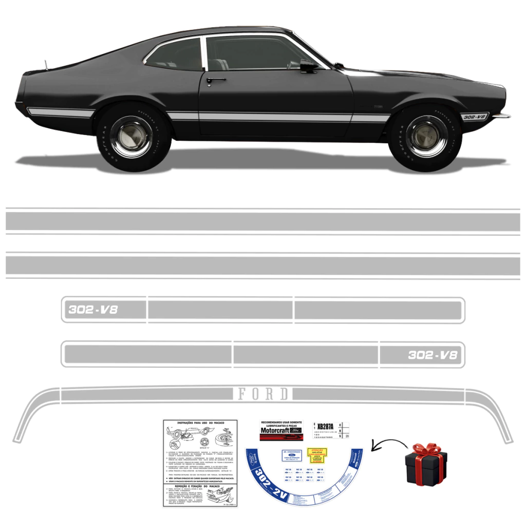 Kit Faixa Ford Maverick 308-V8 Fase 1 - 1973 1974 1975 1976 Adesivo Cinza Lateral e Traseira + Etiquetas de Advertência Motor Completo **BRINDE**