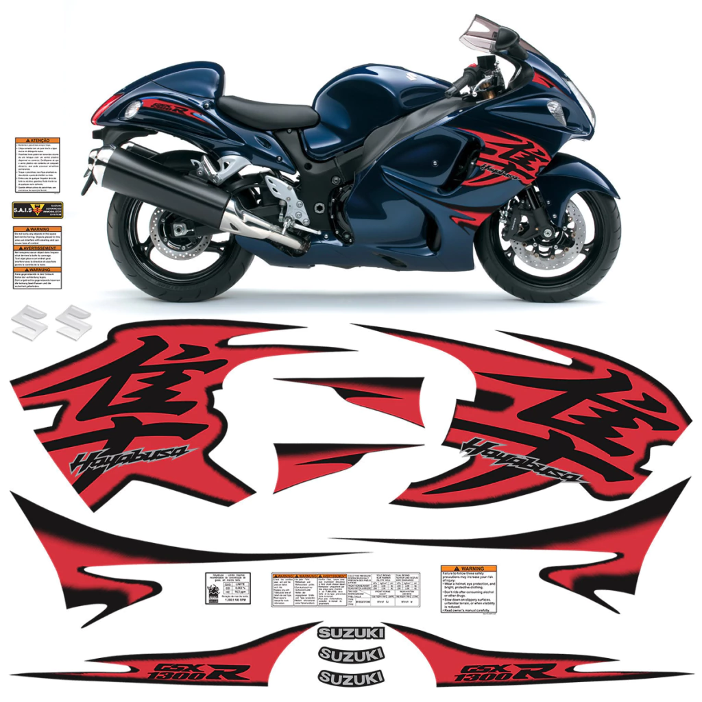 Kit Adesivos Faixa Vermelha P/ Suzuki Hayabusa Gsx R 1300 2012 Moto Preta + Emblemas Advertência e Logo Resinado