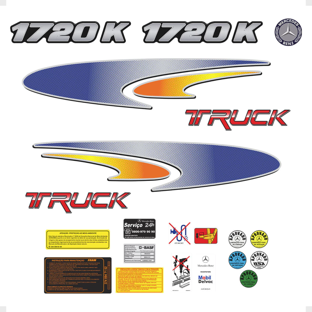 Kit Adesivos Faixa 1720K Truck Lateral + Logo Mercedes Benz Frontal + Emblema Advertências Aprovado Compatível Com Mercedes Benz 1720K Moderno Emblema Lateral Resinado Cromado - Genérico