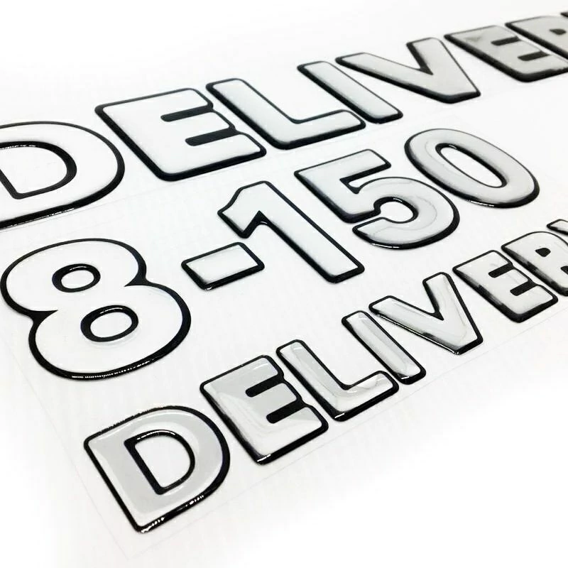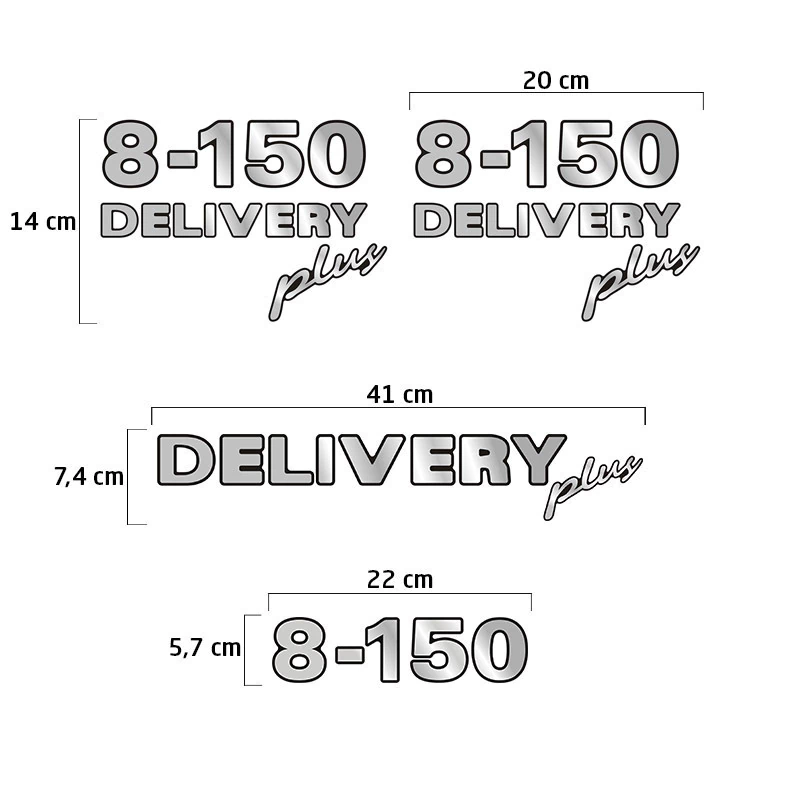 2 Emblemas 8-150 Delivery Plus Resinado (lateral) / Fabricado em Poliéster Cromado / Dimensões: 20 x 14 cm