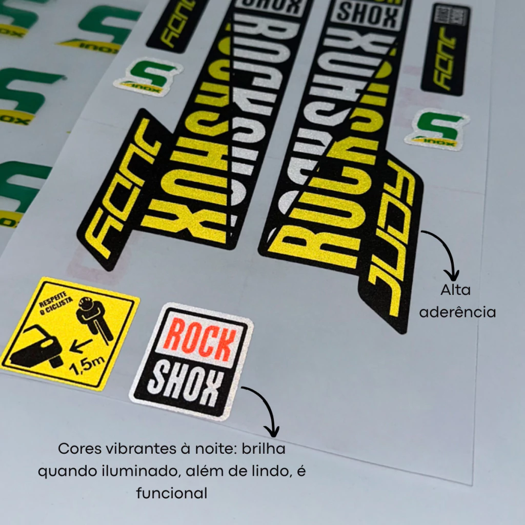 2 Adesivos (Rock Shox) / Fabricado em Vinil Refletivo / Dimensões: 19,6 x 5,5 cm