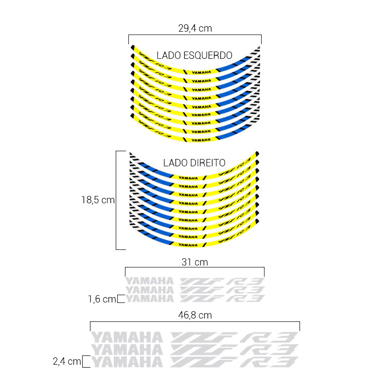 18 Filetes Yamaha YZF R3 / Fabricado em Vinil / Dimensões: 29,4 x 18,5 cm