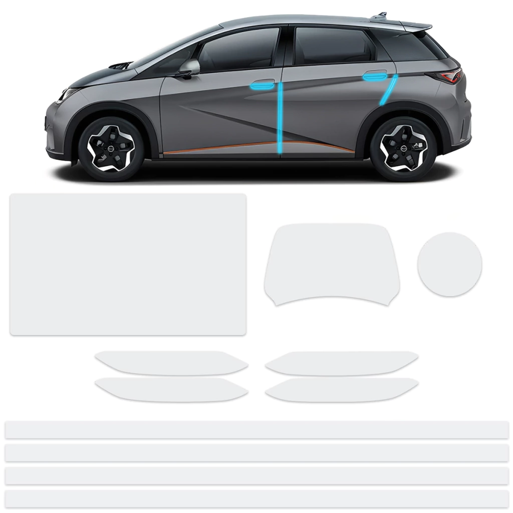 PPF Premium Película Brilhante para BYD Dolphin 2025 – Multimídia, Volante, Painel de Velocidade, Para-choque Traseiro, Maçaneta e Protetor de Porta