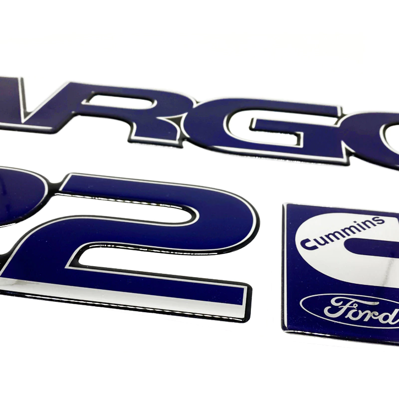 2 Emblemas Cummins (lateral) / Fabricado em Poliéster Cromado / Dimensões: 8,5 x 6 cm