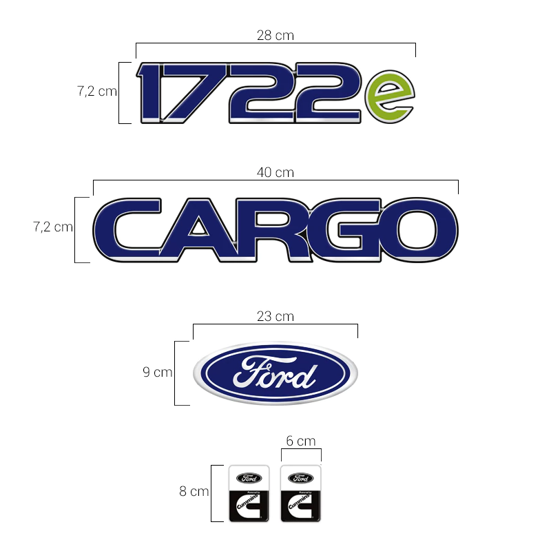 Kit Emblemas Compatível Cargo 1722e Adesivos Caminhão Ford Cummins Resinado + Etiquetas Advertência/Atenção Amarelo - Completo