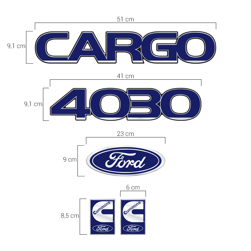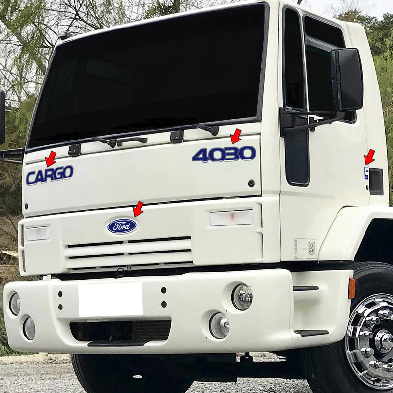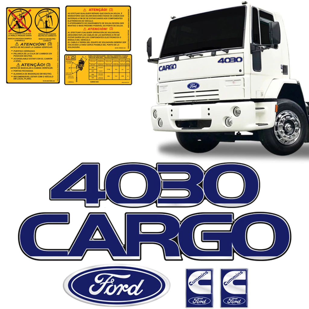 Kit Emblemas Compatível Cargo 4030 Adesivos Caminhão Ford Cummins Resinado + Etiquetas Advertência/Atenção Amarelo - Completo