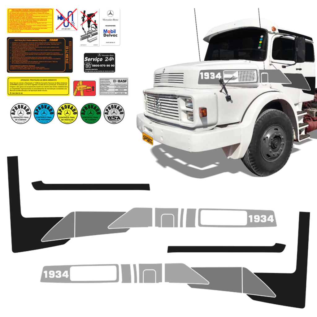 Kit Faixa Lateral Caminhão Mercedes Benz 1934 + Adesivos Etiquetas Advertência e Aprovado do Para-brisa -