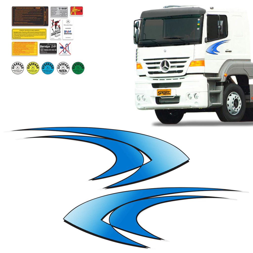 Kit Faixa Lateral Mercedes Benz 2004 Azul + Adesivos Etiquetas Advertência e Aprovado do Para-brisa -