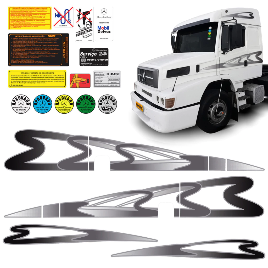 Kit Faixas Mercedes Benz 1938 1998/1999 Grafite e Cinza + Adesivos Etiquetas Advertência e Aprovado do Para-brisa -
