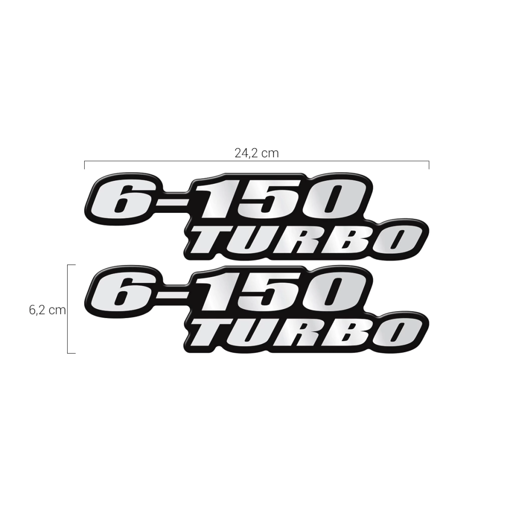2 Emblemas Resinados 6-150 Turbo / Fabricado em Poliéster Cromado / Dimensões: 24,2cm x 6,2 cm